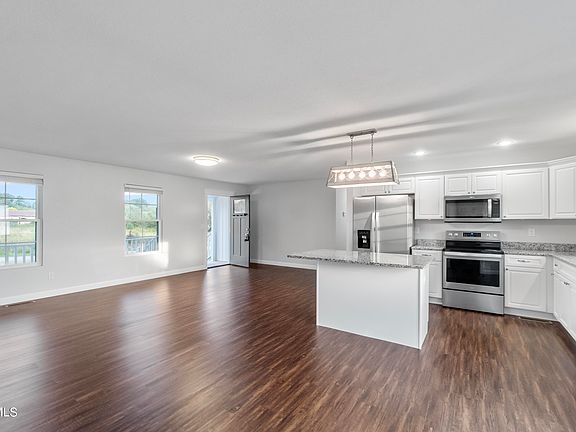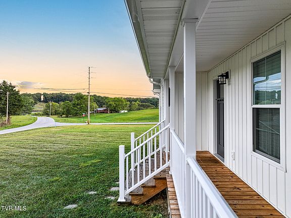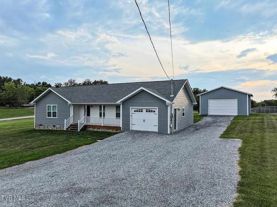 Better than new with mountain and countryside views! This striking home is placed on a huge 0.77-acre level lot, 4 years old and ready to be moved in tomorrow. This 3BR/2BA features a great floor plan with entry that flows into the great room with dining area and the kitchen neatly tucked into the corner. The kitchen features stainless steel appliances including refrigerator, large granite topped kitchen island with bar seating, gorgeous farmhouse style lighting, shaker style white cabinetry, granite countertops and double sink. This floorplan is super convenient with the laundry just off the kitchen and connecting to the main level garage. Down the hallway is the primary bedroom featuring a long walk-in closet with an adorable barn door leading into the primary bath with a large tub/shower combo and a marble topped shaker vanity. There are 2 other bedrooms that are good sized with beautiful windows and good closets. This entire home is very low maintenance with all luxury vinyl plank flooring throughout and no thresholds for robotic vacuums to catch on. Outdoors the corner lot is level with a well-established yard and the detached garage is 26'X30' with an oversized 16 ft wide and 10 ft tall garage door. Insulated with concrete floor and lighting. Great back deck for entertaining and a fire pit. Centrally located between Greeneville, Exit 30 & Exit 36 of I-81 and near Mosheim.