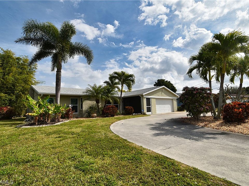 PRICE IMPROVEMENT....for dream home in Cape Coral! This single-family home boasts 3 bedrooms, 2 bathrooms, and a 2-car garage, providing ample space for you and your family. The kitchen features granite counters, stainless steel appliances, and tile flooring, perfect for preparing delicious meals and entertaining guests. Relax and unwind in the Florida room or enjoy the beautiful Florida weather on the large covered patio. The circular driveway adds convenience and curb appeal, while the fully fenced yard offers privacy and native Florida landscaping. With a new electrical panel (2020 )newer roof ( 2018 ) and newer AC ( 2019 ) you can rest easy knowing that this home is well-maintained and move-in ready. The home has partial impact windows installed in 2020 that provide peace of mind during storm season. Don't miss out on this incredible opportunity to own a piece of paradise in Cape Coral. One year Home Warranty is provited with accepted offer. Per Seller existing Flood Insurance Policy is transferable .Schedule a showing today and make this house your forever home!