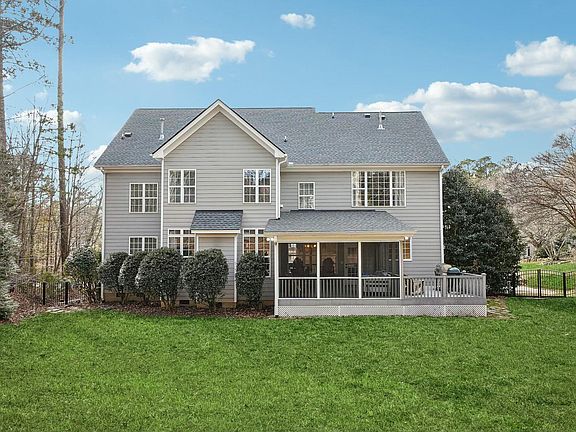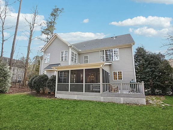 Discover this stunning custom home in one of Apex's most desirable neighborhoods, Jamison Park! Situated on a quiet street on large, 0.52 acre lot, this home offers the perfect blend of elegance, comfort, & functionality. Step inside to find an open floor plan with soaring 2 story foyer and 10-ft ceilings, site-finished hardwood floors, & abundant natural light. Updated kitchen features modern finishes & great space for entertaining. Home office and 1st fl guest suite also on main level. Huge home theater/bonus room on 2nd floor incl stairway to enormous unfinished attic. Enjoy NC's beautiful seasons from the large screened porch and Trex deck overlooking private, fenced backyard. Brand new roof (2024) & updated light fixtures for a more modern touch. Located within walking distance to Middle Creek High School, Middle Creek Parks and the community pool, this home will check all the boxes. VA eligible buyers only- ASSUMABLE VA loan at just 2.75% interest—a rare opportunity in today's market!  Don't miss your chance to own this exceptional home!