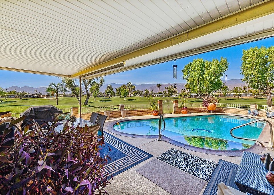 Escape to a private retreat where golf course fairways, mountain peaks, and a private pool and spa create the perfect sweeping backdrop for your desert stay. This beautifully designed 2-bedroom, 2-bathroom home features its own pool and spa, offering resort-style living in a vibrant 55+ community. Inside, the open-concept living area invites you to relax with a cozy fireplace, waterfall, smart TVs, and floor-to-ceiling windows showcasing sweeping views from nearly every room. A full-size Murphy bed in the living room provides extra sleeping space for guests. The remodeled kitchen includes high-end appliances, a refrigerator, stove, microwave, and dishwasher, so you can enjoy meals at home with ease. For added convenience, the home also has central AC, high-speed WiFi, and an in-unit washer and dryer. The highlight of this property is the private pool, spa, and patio overlooking lush golf course greens and panoramic mountain vistas. Whether sipping your morning coffee, soaking up the sun, or swimming under the stars, this outdoor space is your own desert sanctuary. The primary suite offers direct access to the pool deck and breathtaking views, while the second bedroom ensures comfort and privacy for guests. Two full bathrooms make it easy for everyone to refresh and recharge.