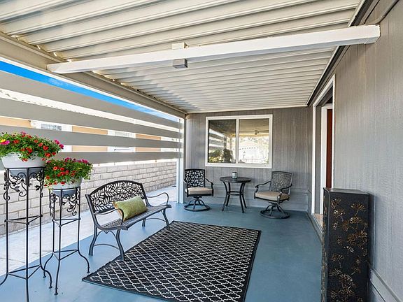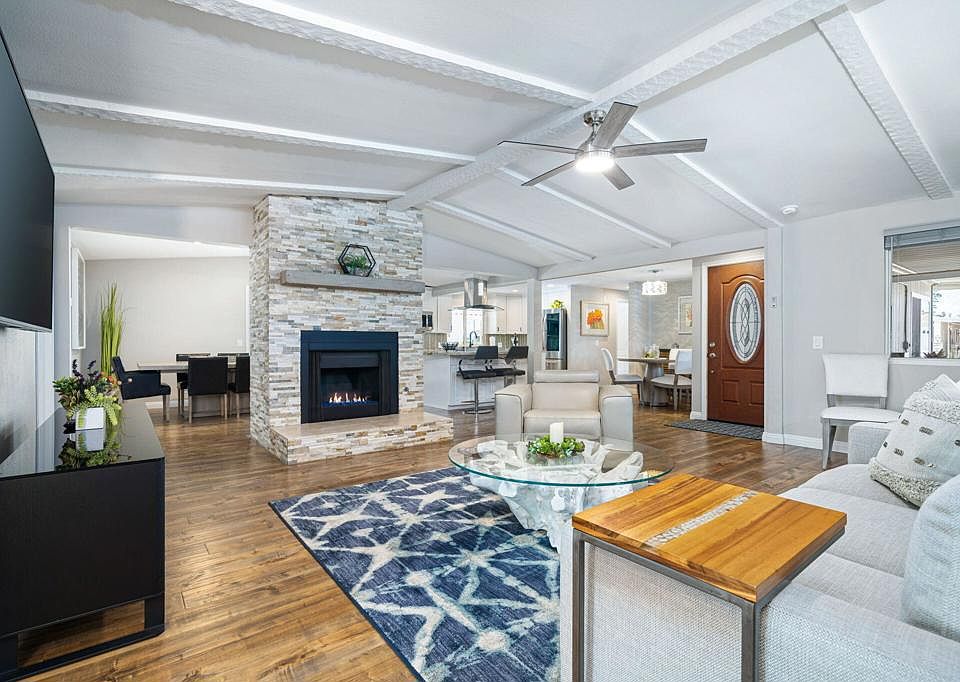 Welcome to your dream home nestled in a serene 55+ community, where luxury meets comfort and convenience. As you enter through the courtyard, prepare to be captivated by the breathtaking mountain views that greet you. Step inside to discover a spacious living area accentuated by a freestanding fireplace, seamlessly connecting the living room, dining room, and kitchen, creating the perfect ambiance for cozy gatherings and entertaining. The interior boasts cathedral ceilings and luxury vinyl plank flooring throughout, exuding elegance and warmth. The gourmet kitchen is a chef's delight, featuring an expansive granite island, newer stainless appliances, including a 5 burner gas stove, and a unique French 4-Door Refrigerator with a charming 'window' feature. This home offers three bedrooms, two baths, plus a versatile office space, providing ample room for relaxation and productivity. Dual pane windows, tinted with low E glass, ensure energy efficiency and tranquility. Step outside to your private oasis, where a large backyard awaits with a blend of concrete and grass inlay, perfect for outdoor activities and enjoying the sunshine. Entertain guests or unwind in the covered patio area, complete with a hot tub that seats five, offering the ultimate in relaxation and comfort. For added comfort, a new 1 1/2 ton split AC unit has been installed in the master bedroom, complementing the newer AC system with a lifetime warranty. Indulge in the amenities of the community with a low