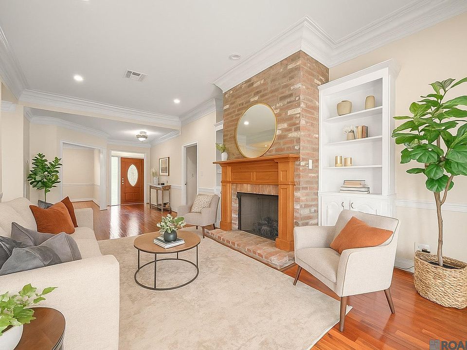 Extra-wide doorsTwo covered patiosCustom cypress cabinetsGranite countersTwo en suite bedroomsGas cooktopBrick fireplace