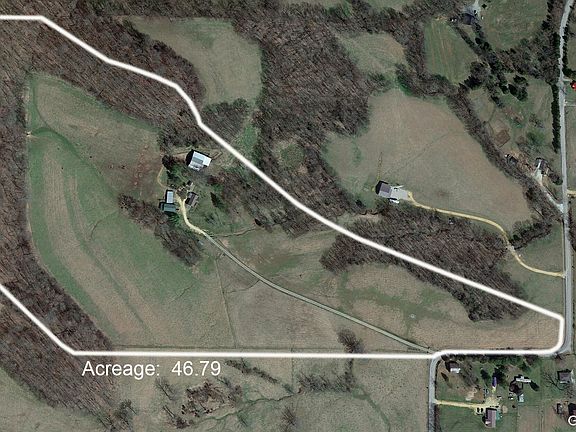 Absolute Auction! Saturday June 17 at 10:00 a.m. Live On-Site Auction! Home & 46.74 acres with shop & barn! This basement brick home contains 1275 sq. ft on main level (per courthouse records). Includes living-dining-kitchen open concept area with fireplace, 2 bedrooms, 2 baths. Washer/dryer connections. Hardwood floors. Covered deck. Basement is partially finished. 2 rooms with tile floors & large walk-in closets, laundry room, 1/2 bath and 2 car garage. Central H/A. Replacement windows. Metal roof. Public water. Also improved with 30' x 50' shop with new 12' high overhead door. Large cattle/horse barn with attached sheds. Other outbuildings. Land is level to rolling to some wooded hills. Approx. 80% open. Fenced and watered by spring and county water.