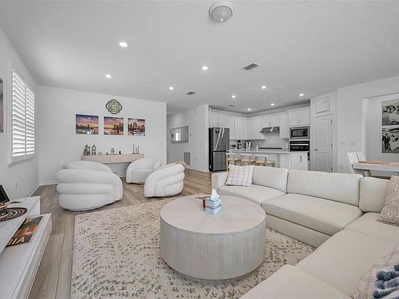Elegant, better than new, home in sought after Whispering Pines. Welcome to this immaculate 3 bedroom, 3 bath residence that offers a perfect blend of modern upgrades, energy efficiency and versatile living spaces, designed to suit your lifestyle. Step inside to discover a bright, open layout featuring a Chef's Kitchen with center island (Luxe Upgrade Package including extra large 18" cabinets with crown molding, stainless steel appliances, large cabinets with crown molding and soft closing doors, pull out trash cabinet and walk in pantry. Plantation Shutters throughout (added by owners after closing) add timeless style and comfort, while the custom master closet (also added post closing) creates functional luxury and organization. The Bonus Room offers a flexible space for your home office, gym or playroom and has upgraded wood flooring. The Large gathering Room, kitchen and Dining Room are perfect for everyday living and entertaining. Sliding Glass Doors allow access to the extended lanai and roomy backyard and a bonus of no rear neighbors. Master Bath features upgraded double shower and beautifully and functionally designed custom closet with dresser. Secondary bedroom has an upgraded Gazebo wall with windows - lovely view from inside, charming curb appeal from outside. Popular Whispering Pines is a gated community that offers a Clubhouse with a pool, playground, dog park & walking trails. Close to shopping, restaurants and roadways. TV and Internet are included in HOA fees.