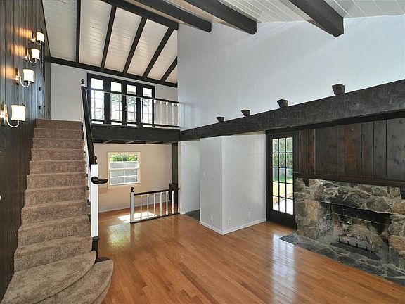 This ONE OF A KIND property exudes STORYBOOK character & charm from every corner. Originally built in 1945 as a cottage and later expanded to create this unique home. Details are abundant here! Crisp freshly painted white walls, Natural wood beam ceilings overlook custom stained glass porthole windows and rustic wood paneling. Built-in cabinets with leaded glass doors and flanking shelves add depth and charm. The cozy living room has beamed ceilings, a large stone fireplace, french doors, hardwood flooring and wood accents are everywhere. Formal dining room offers built-in china cabinets and a built-in buffet. The Kitchen has been updated to today's standards with white cabinets, quartz counter tops and plenty of space yet maintains still a touch of old world charm. Upstairs is a loft family room with french doors and a private balcony. Three charming bedrooms with and two completely updated bathrooms. Outside in the backyard is a wonderful brick patio with a spectacular rear deck including a built in Built in BBQ with seating. A separate above ground spa, custom lighting & so much more. A detached two car garage and carport area, natural wood fencing and mature landscaping make this home a unique and special place. Come see for yourself!