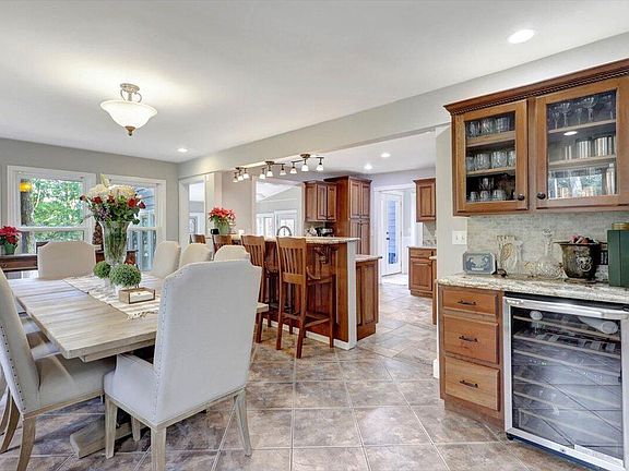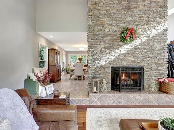Step into the stunning family room, featuring soaring ceilings and a custom full-height stone fireplace as the centerpiece. The open floor plan seamlessly connects the family room to the dining area and a gourmet kitchen, where high-end granite countertops, custom cherry cabinets, and a 36-inch dual fuel Wolf range await to inspire your culinary creations.