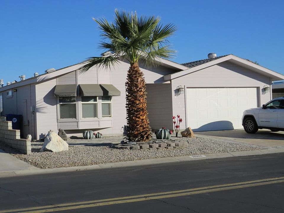 Canadians seeking CASH buyers, short escrow OK. Perfect desired Silvercrest home, attached oversized 2 car garage, 3 bedrooms, one with twin beds, one used as Den with Arizona Leather brand queen sofa bed and the Master suite, 2 baths, master bath has custom soaker tub with shower. Cozy patio with alumawood cover (approx 28' long) in rear and also front covered alumawood entry. Mountain view in front. Custom hardscape. with flagstone accents. Silvercrest model with 6 inch exterior walls, vaulted ceilings , custom granite counter tops and newer appliances. Center island in Kitchen, pull out shelves in most cabinets. Separate Laundry room. Sold furnished as shown. Arizona Leather brand sofas in living room. Tastefully furnished throughout. This has been a seasonal residence, with very gentle use. Ready to move in. Patio Furniture included as well. Natural gas connnection on patio for fire pit or BBQ grill. Storage galore in home and attached oversized garage.