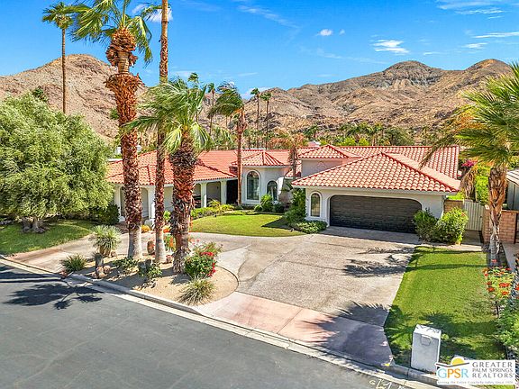 A MUST SEE framed by SWEEPING VIEWS in South Palm Springs, this stunning home in Parc Andreas welcomes you past the gates and up a grand circular drive, where dramatic mountain vistas steal the show from the coveted West side of the community. Step through the architectural colonnade and double doors into a home filled with soaring ceilings, wood plank flooring, and stylish finishes throughout. Multiple living areas include a sunken living room that flows seamlessly into formal dining and a family room with a cozy fireplace, wet bar, and beverage fridge ideal for entertaining or relaxing. The chef's kitchen impresses with a walk-in pantry, counter seating, and breakfast nook, while a nearby powder bath, spacious laundry room, and direct access to an oversized 4-CAR garage add everyday convenience. The ultra-private backyard is your own resort-style retreat, complete with a sparkling pool, spa, and covered patio for year-round enjoyment. The well-designed floor plan offers excellent bedroom separation, with the Primary Suite featuring a retreat space, pool access, dual vanities, a walk-in shower, separate soaking tub, and an abundance of closet space including three walk-ins. Guest Bedroom Two enjoys an ensuite bath with sleek finishes, while Guest Bedroom Three opens directly to the pool and includes its own bathroom with garden access. With easy access to top hiking trails like Murray Canyon and just minutes from the best of Downtown Palm Springs, this home is built for the ultimate desert lifestyle take the Matterport VIRTUAL TOUR to experience it for yourself!