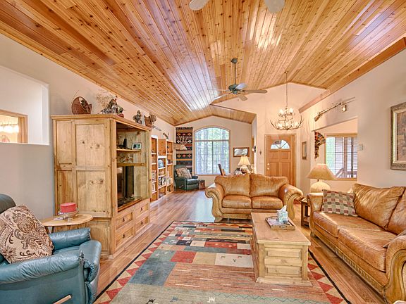Beautiful cabin being sold on 2 lots in Bent Oak to include parcel # 411-94-058 Heavily treed with wonderful forest views! One owner and has pride of ownership throughout! Cedar sided 3 car garage, vaulted wood ceilings, greatroom with large stone fireplace, additional office space, split bedroom floorplan, master bedroom with sauna, formal dining room plus an eat in kitchen nook. Large back deck with beautiful views of forest. Many custom amenites and built by one of the top Builders on the mountain! Quiet and private street with spectacular towering oaks and pines. Firepit in the back yard with built in seating are just a few of the many amenites this home has to offer. Being sold with some furnishings. Close to National Forest access, golf course and trails