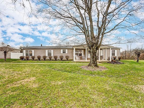 Spectacular 5.1 acre setting nestled around 2356 sq. ft. ranch in like new condition. 4 bedrooms including master suite, 2 full baths, great room with fireplace, living room, dining room, updated kitchen & baths, huge Amish built 3 car garage with upstairs storage, additional 24 x 36 pole barn with concrete floor & garage door at both ends! Relax on front porch or on huge rear deck and enjoy this private tract that sits back from the road, features a creek, fenced area for dogs. Roof and gutters - 2019, newer kitchen appliances, new counter tops - 2019, new front and back doors-2020, deck - 2020, new vinyl siding - 2023, new fenced dog area -2017, new air cond.- 2019. Newer flooring throughout. Manufactured home.