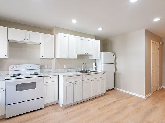 Newly renovated unitWhite shaker cabinetsWhite appliances