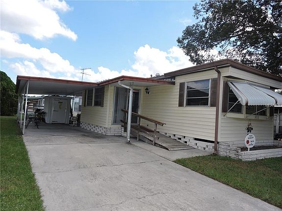 Cute little place, move in ready. It has 2 bedrooms, 1 and a half baths, small workshop or storage. The steps to get in are covered by a handicap ramp that can be easily removed. Some furniture stays. Home has a spacious living room with beautiful vinyl plank flooring, the small dining room is in the kitchen. It is in a wonderful Park where there are amenities, club house, pool, shuffleboard. You own the land and just pay a yearly HOA fee of $240.