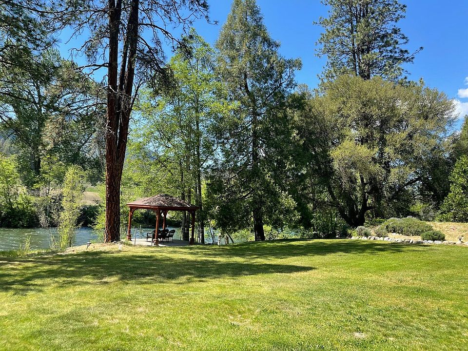 Relax on the River, located near wineries & just a few miles from Applegate Lake. This wonderful property offers a beautiful 2837 sq ft home on 2.98 acres of flat land along the Applegate River. The spacious SINGLE LEVEL HOME features 3 bedrooms each w/a private bath, + a separate office w/ beautiful wood & leaded glass doors. The Primary Master is spacious w/2 walk-in closets, water closet, tile shower & separate tub. The lg kitchen is appointed w/granite counters, dbl ovens, 6 burner stainless cooktop, wine refig, a lg. island, & beautiful wood cabinetry. The kitchen is open to a spacious living area w/views & access to a lg patio, beautifully manicured yard, mature trees & the river. Additional home features incl. formal dining, custom wood doors, high ceilings, wood beams, built-in cabinetry, wet bar, 2 wood stoves, propane stove, 4th full bath, laundry rm, 2 car garage, vinyl fencing, fenced garden area, 1232 sq ft barn/shop, & a 16x19 pavilion near the river's edge.