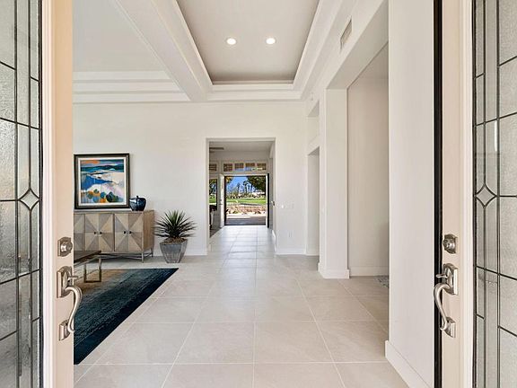 Sun City Palm Desert - Beautifully REMODELED MARQUIS model on the Santa Rosa signature 13th hole. South facing yard affords magnificent mountain, lake and golf course views. The gated front courtyard welcomes you with new low maintenance landscaping & overlay surfaces. Enter through the stunning leaded glass double doors to the spacious great room and adjacent den with custom 24 inch porcelain flooring throughout. The chef's kitchen features new maple soft-close cabinetry and hardware, quartz counters, tile backsplash, sink, faucet, new electric range, bev/wine refrigerator and LED ceiling lighting. The kitchen has both an eating bar and dining area open to the spacious family room with tiled fireplace, plantation shutters, new UV energy efficient windows allowing southern views. Step through the french doors to custom overlay deck, desert landscaping, alumawood patio cover with panoramic views. The primary suite features, coffered ceilings a new bath complete with vanities, quartz counters, tiled walk-in shower, aquatic tub for 2 and built in closet system.The guest suite has newly installed closet system, bathroom with quartz counter, sink and hardware. The laundry room has a built-in storage & utility sink which offers access to the 2 Bay + golf cart garage. High efficiency A/C with electric heat pump & Wi-Fi thermostats were installed in 2024. This state-of -the-art remodel makes this home one of a kind.