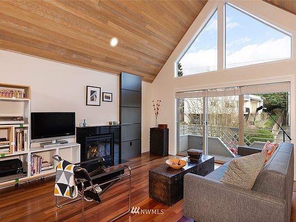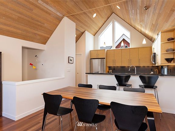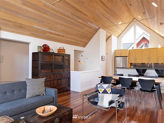 Not your average townhouse! Award-winning design in an exceptional, quiet Wallingford location, this one is a forever home. Top floor open living area, with soaring, wood-planked vaulted ceiling, stylish modern kitchen, luxurious hardwood floors, cozy gas fireplace and spacious breakfast balcony. Plenty of room for parties, and a .5 bath for convenience. Middle floor has two generous bedrooms, including a primary suite with .75 bath and walk-in closet, laundry, and full bath. Daylight lower level has one more bedroom, powder room, and garage. Refreshed with interior paint and new carpet. Leave your car at home and wander to some of the tastiest spots in the city (Art of the Table, Joule, and Sea Wolf, to name a few!) on Stone Way. Enjoy!