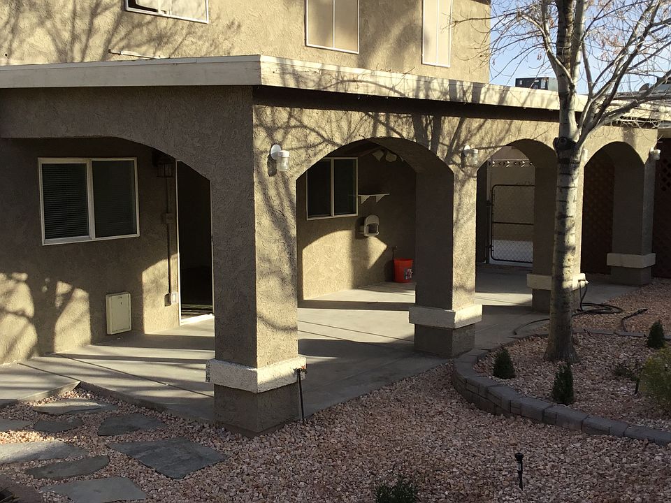 Additional 760+ sqfeet of living space, 4 extra rooms plus an added garage making this a 3-car home. RV gate and parking, dog run with grass & gates, two doggie doors for pet convenience! Front courtyard enclosed w/ wrought iron, powder coated to last. Security doors. Bdrm & Full bath dwnstrs Master has a retreat AND an office totaling 3 rooms. His hers master closets. Fresh paint. New rock & shrubs. A steal for over 2200sf