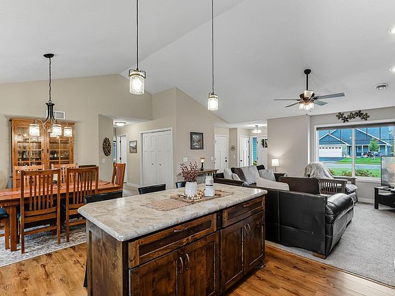 Experience the ease of single-level living in this well-maintained 2-bedroom, 2-bath slab-on-grade home offering 1,310 sq ft of thoughtfully designed space. The open layout features in-floor heating throughout for consistent comfort, complemented by central air, newer kitchen appliances, and a cozy gas fireplace. All living areas are on one level, making the home ideal for accessibility and everyday convenience. Step outside to a pergola-covered patio and enjoy your private backyard oasis—perfect for morning coffee, quiet evenings, or entertaining guests. Situated on a generous 1/36 acre lot, the property offers ample outdoor space with nearby parks and walking paths just steps away. An attached garage accommodates two or more vehicles, adding to the home's practicality. Whether you're downsizing, starting fresh, or simply seeking a low-maintenance lifestyle, this inviting residence delivers comfort, functionality, and charm in a peaceful setting.