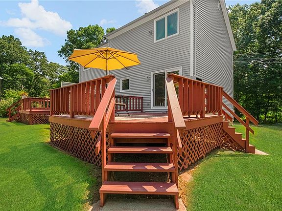 Incredible private and quiet condo complex. Minutes to Wickford and Narragansett/Newport. Down the street is North Kingstown Town Beach. The unit has a large deck and backyard. Condo is 2 bed, 1-1/2 bath with gas heat, town water and central AC. Full basement with 580 sq. feet of unlimited potential. Hardwood floors on 1st floor new plush carpeting upstairs. Master bedroom has walk in closet. Open bright unit with high ceilings and skylights were replaced with roof. Updated windows and slider, Owner installed gutter leaf/shield protectors. Wickford Glen is a perfect annual residence or a seasonal haven. HOA fee also includes water & septic.