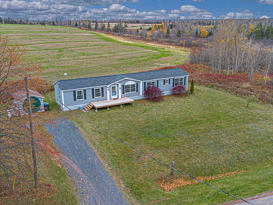 Affordable living in this 12 year old mini home sitting on 5 acres of land located approximately 15 minutes from Charlottetown. This home features a spacious living room with heat pump, large eat in kitchen with ample storage, an island and 3 appliances (fridge, stove & dishwasher) 3 bedroom, 2 full bathrooms, (primary bedroom has a full ensuite bath). Recent upgrades include new vinyl skirting and front patio. Mature 5 acres with Confederation trail intersecting the property.