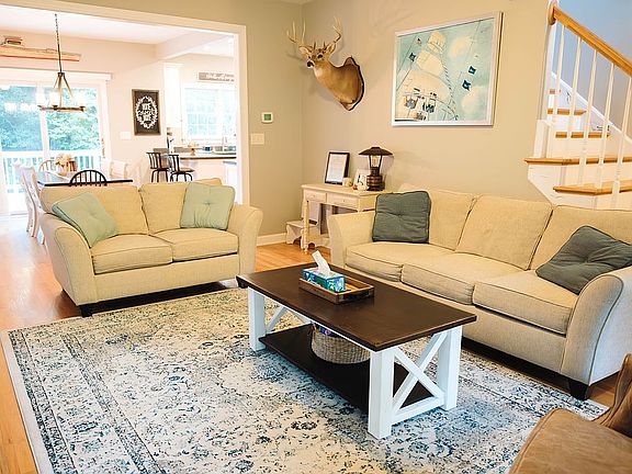 Beautiful 2,226+/- sq. ft., 3 Bedroom, 2.5 Bath Cape Cod has bright and sunny appeal with spacious front porch. Lovely 1.4 acre lot offers comfortable, private setting in established, water access community. Attractive features include brick foundation, easy maintenance vinyl siding, aggregate sidewalk, 9' ceilings, huge rear deck, custom built storage/potting shed and attached 552 +/- sq. ft. 2-car garage. Lovely hardwood floors in main living areas and gas fireplace with marble surround and hearth, and decorative mantel in living room. Crisp white, solid wood cabinets in kitchen with stainless steel appliances, pantry closet. First floor Master Suite has large bathroom featuring ceramic tile floor, double vanity, jetted tub, walk-in shower, linen closet and walk-in closet. Utility area with full size washer & dryer. Two bedrooms upstairs, and hall bath with bathtub. Attic storage space access from upstairs bedroom closet. Light and airy bonus room above garage is ideal for office, guest overflow or recreation. Wired for portable generator which conveys. Water System installed in 2023. Craw space resealed with humidifier in 2023. Wired for invisible fence. Deeded water access. Community boat launch and dock. Private golf cart friendly road has lovely entrance with mature white crepe myrtles and is maintained by HOA.
