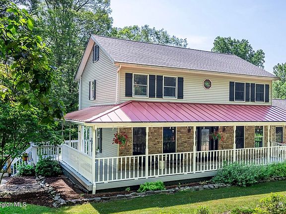 CHARMING ARTS AND CRAFTS THREE BEDROOM GEM nestled on 3.3 acres suited for full time living or weekend getaway. Turn off a country road and immediately feel the serenity of this enchanted property. As you approach notice the stone veneer and majestic porch with the striking red metal roof that wraps the entire perimeter of the house. Walk the blue stone path flanked by perennial shrubs and flowers as you head toward front door. Enter the house and step onto meticulously maintained oak hardwood floors that flow seamlessly from the living space to the dining area and the light filled kitchen. In a cozy corner of the living room sits a wood stove creating a space where you can curl by the fire during the colder months. A bay window with streaming light fills the living and dining areas. In the kitchen the ceramic tile countertops and backsplash create an earthy warm feeling along with a large walk-in pantry, and stainless steel appliances. Gaze out the kitchen window situated above the custom hammered copper sink to the peaceful view of the back yard. There is a whimsical half bath near the kitchen with tiled floors and stain glass fixtures. The first floor also includes a bonus room used as an office/studio and a laundry/mud room that leads out to a meticulously maintained two car garage.