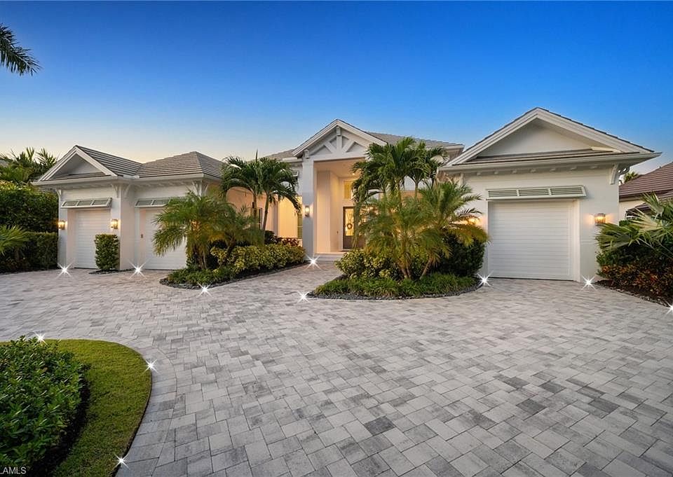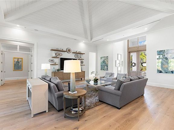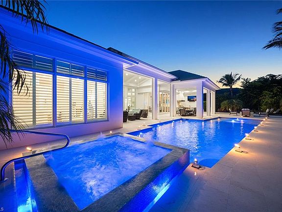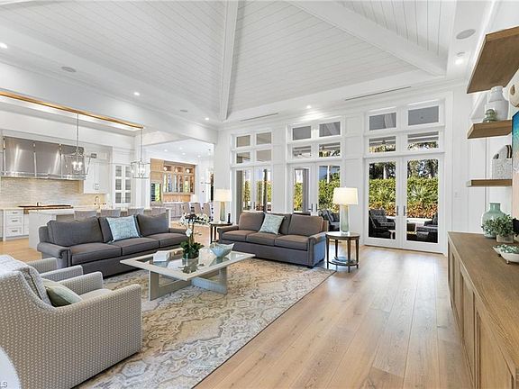 Tucked away on the quiet Cuddy Ct. cul-de-sac, this 4-bedroom plus den coastal retreat lives effortlessly on one level. Step through glass-pane double doors into a bright, inviting great room framed by classic tongue-and-groove ceilings and expansive walls of glass that flood the space with natural light. The show stopping kitchen features Crystallo quartzite countertops, custom Ruffino cabinetry, and an oversized island—all seamlessly connecting to the dining area with a wet bar and wine cooler. A tucked-away butler’s kitchen elevates everyday convenience with a walk-in pantry, ice maker, additional storage, and more, making entertaining truly effortless. The primary suite is a private sanctuary, offering two beautifully finished closets, a serene spa-like bath, and direct access to outdoor living. Family and guests will feel perfectly at home in any of the three ensuite guest rooms. The outdoor living experience is exceptional, highlighted by a custom summer kitchen, a 30-foot pool with sun shelf, built-in firepit, and abundant deck space for soaking in the Naples sunshine. A covered lounge area—complete with roll-down screens and shutters—ensures comfort and livability year-round. Timelessly crafted by Coleman, this residence blends luxury, functionality, and coastal charm to impress even the most discerning buyer.