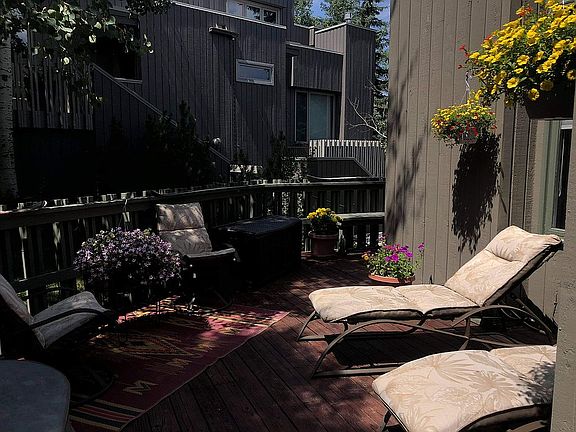 Beautifully upgraded high-end custom cabinetry and two full baths upstairs plus a powder room-all nicely outfitted. Quiet location within the complex. Large deck. Roof recently replaced. Free bus out front and one stop to two creeks and five minutes from Village .1 dog permitted. Rarely rented but great producer if want to rent. Recent upgrades include private hot tub on large deck, hardwood floors, new facing on fireplace, new chandelier, new furniture. All inquiries by Email. Qualified buyers and realtors representing qualified buyers only (co-broke available).