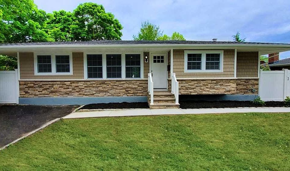 Beautiful with all the bells and whistles! Welcome to St James! Fully renovated ranch featuring New stacked stone and vinyl cedar impression siding. New windows+roof+gutters+doors. Brand new kitchen white shaker cabinets, quartz counter tops stainless steel appliances and gas cooking. 2.5 fully updated bathrooms. 3 bedrooms hardwoods throughout. Freshly painted new molding trim and doors. New boiler+ hot water heater +Central air and recessed lighting. New 24 ft deck and fully fenced yard. Finished basement. Virtual tour available.