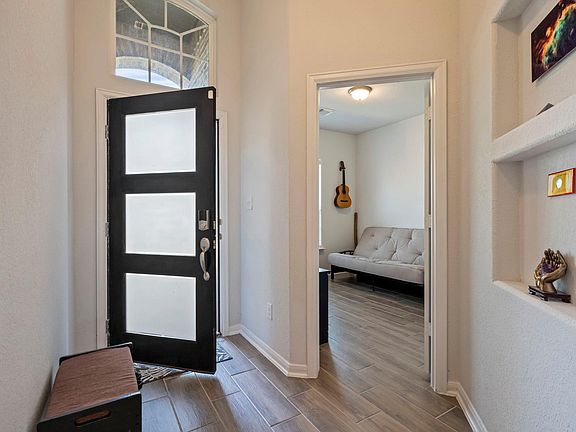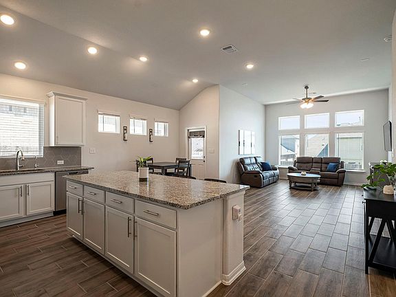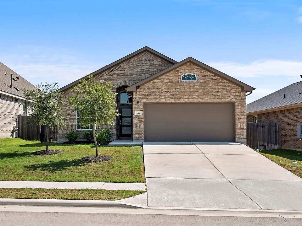 Experience the ease of Sunfield living, where everyday life feels like a retreat. This better-than-new single-story home offers 3 bedrooms, 2 baths, plus a dedicated office. From the moment you walk in, the open layout feels bright and welcoming, with tall ceilings, abundant natural light, and wood-look tile throughout the main living spaces setting the stage for everyday comfort and effortless style. The kitchen is the heart of the home, featuring a large island, stainless steel appliances, ample cabinetry, and seamless flow into the dining and living areas—perfect for entertaining or simply enjoying family time. The private primary suite offers dual vanities, a separate shower, and a spacious walk-in closet. Secondary bedrooms provide flexibility for guests, hobbies, or additional workspace. Step outside to a covered patio and private backyard, ideal for relaxed evenings or weekend gatherings. Thoughtful details and smart design make this home truly move-in ready. Living in Sunfield means enjoying some of the best community amenities around: multiple pools, splash pad, fishing ponds, walking and biking trails, an on-site elementary school, open-air pavilions, and two lazy rivers—one just a short 0.3-mile walk from your front door. All this with quick access to I-35, the 130 Toll Road, shopping, and dining, offering the perfect balance of convenience and community.