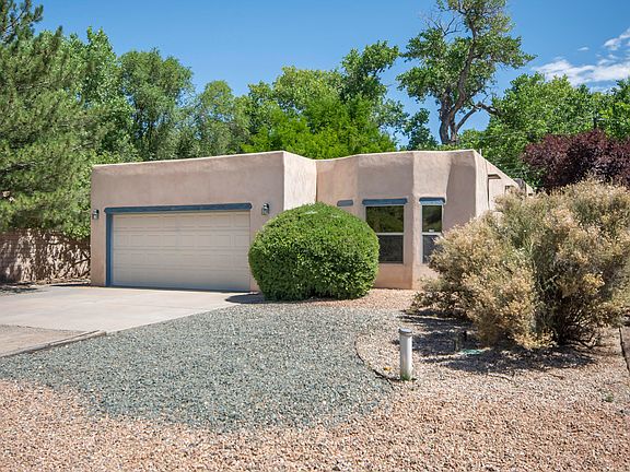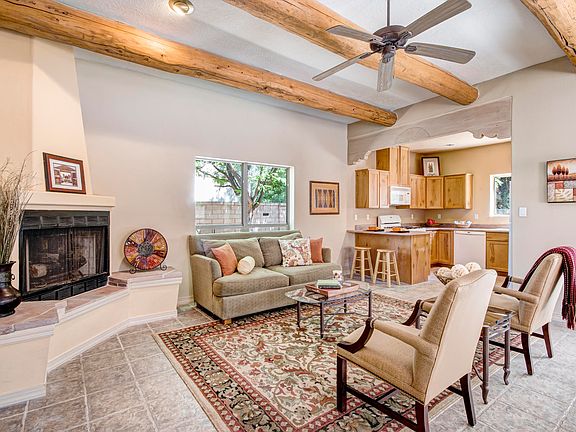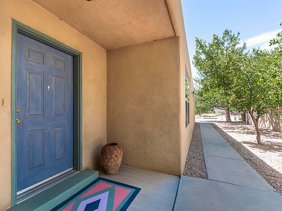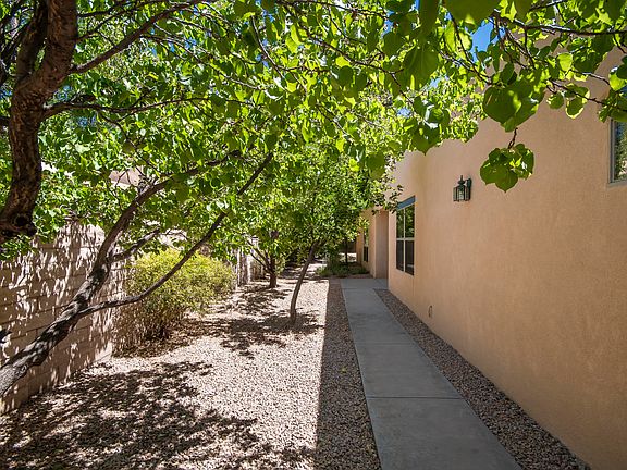 Charming Corrales casa located steps from the bosque on a lush private lot bursting with roses, flowering vines & fruit trees, including apricot & apple. Open floor plan features beautiful Italian tile floors (no carpet), huge spruce vigas, custom fireplace & large master (w/ big walk-in closet) that opens to lovely portal. Kitchen features maple cabinetry, gas stove & newer appliances. Newer water heater (2019), newer evaporative cooler (2019) & owned water softener. Peaceful yard offers serenity & privacy perfectly combined with easy maintenance. Situated in the center of the Village with an easy walk to the farmer's market, restaurants, library & amenities. Corrales at its very finest & most affordable!