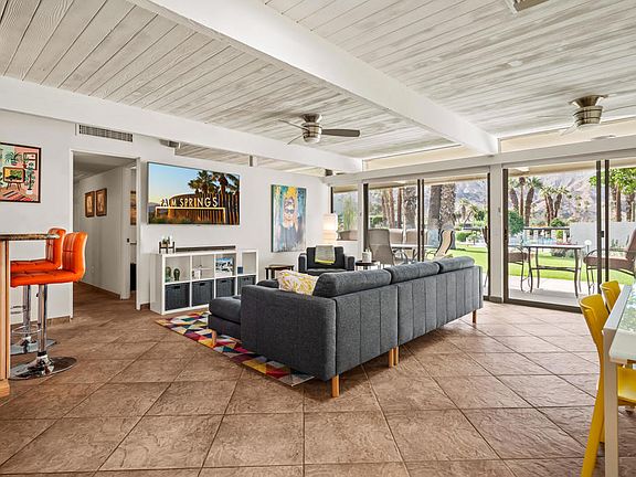 Discover luxury living in the historic Sandpiper community with this beautifully updated 3 BR / 4 BA mid-century condo, spanning approximately 2,050 sq. ft.. An open floor plan seamlessly joins the living, kitchen, and dining areas, leading to a poolside patio with stunning mountain views. The unit includes two primary bedroom suites, a guest bedroom, and a spacious ''great room'' with a dedicated laundry room alongside four beautifully appointed bathrooms throughout. The condo boasts extensive upgrades, including a fully modernized kitchen with stainless steel appliances, granite countertops, new cabinetry, and a gas range, This exquisite home integrates functionality with design, showcasing Sola-Lites, a tankless water heater, dual AC units for optimal climate control, and a water conditioner. The unit maintains the vintage architectural features of the exposed patterned concrete block walls and tongue & groove ceilings throughout. Convenience is key, with two covered parking spaces located just steps from the front door and within minutes from hiking as well as the shopping and dining on the El Paseo. This HOA allows short term rentals for supplemental income. This condo invites you to experience its unique charm. Come, look, and discover why this is more than just a property - it's a lifestyle.