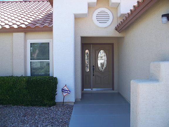 Pride of ownership home w/ Bamboo flooring in walk areas, kitchen & living/dining room ~ New front door ~ Living room w/ fireplace ~ Kitchen w/ breakfast bar, built in microwave, pantry ~ Guest bath w/ large shower ~ Master bed w/ slider to yard, double sink, his/hers closets ~ Bedroom closet w/ organizer ~ Large yard w/ full length patio, grass & desert landscape ~ Driveway freshly painted ~ No HOA ~ Convenient location!
