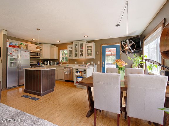 Come see this beautiful & unique, updated home! In a great commute location, a quiet neighborhood and with a very private lot. A detached 768 sq.ft. shop offers a great place to do big projects or additional indoor parking. The kitchen is contemporary with stainless appliances, solid surface counters and lots of storage. The bathrooms have also been updated with modern fixtures. The layoutis very efficient with great use of space. From the entry, walk into the main level with greatroom: kitchen, dining, and living room are all together one one level, and an outdoor living room is screened in next to the dining area, with a covered wrap-around deck, lots of parking, and all with great privacy from neighbors. A split stairway goes up half a level to the owner's bedroom with oversized closet, a second bedroom, and a new and updated bathroom. On the lower level, there is the third bedroom across from the bathroom/laundry room, and the fourth bedroom right at the bottom of the lower half flight of stairs has a sliding barn door for privacy, and is also easily used as a second living area. An oversized pantry is just at the bottom of the stairs and offers immense additional storage and utility. Enough cannot be said about the outdoor living room and covered deck areas right next to the gardens. It is so peaceful to sit in the screened living room and read a book in the evening with the summer sun peeking through the trees. Imagine hosting a summer gathering and making use of the lawn and these fantastic spaces. The location is ideal for the fast commute to Anchorage or the Bases. Just a few minutes down Seward Meridian Parkway gets you to the Parks highway. The roof was replaced in July this year. This home has so much to offer, it is truly a must-see! Call today to schedule your in-person private tour.