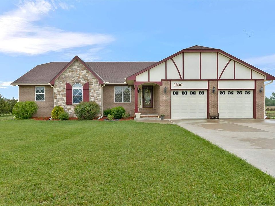Check out the Virtual Tour and pictures of this Beautiful Ranch home on 1 acre! Located just off of Rock Road and 39th South on paved frontage in quiet and serene Prairie Breeze Estates. This custom built, one owner home has over 2200 sq feet in the main level with a full finished, walk-out and view-out basement. Beautiful from the road but even more impressive when you step inside. The main floor living area is completely open with a formal sitting area at the front of the home that continues into a hearth room with a wonderful wood burning fireplace surrounded by built-in cabinetry and shelving. The kitchen features a large island for serving as well as additional eating space. Maple cabinets, pantry, pull out shelving, lazy susan, granite counter tops, all stainless appliances including a double oven. Dining space in this home allows for entertaining large groups of friends or family. There is informal dining just off the kitchen that connects to a formal dining room that would easily seat 12-14 guests. It's just awesome!! The main floor continues with large master bedroom with access to the covered deck, a spacious bath with double vanity's, walk-in shower, and a jacuzzi tub. There are two additional large bedrooms, one utilized as an office with wonderful built-in bookcases and a nicely furnished hall bath. Main floor laundry conveniently located in the extra wide hallway leading to the bedrooms. The basement is huge and light filled with spacious family room, 3 additional view-out bedrooms and a bath that features a triple vanity shared with two additional full bathrooms. This home for a large family or for overnight guests would work so well! There is a concrete safe room for storms as well as plenty of storage in this home. There is plumbing for a wet bar that's ready to go in the basement as well! The closets in every room of this home are walk-in and huge. The one acre lot is nicely landscaped and features sprinkler system in the front and north side yard, two car attached garage and a "Mechanics Dream" 24X40 detached garage for another four cars + work shop area! Pride of ownership seen throughout this home! Great location, totally paved roads, and based on size and amenities is priced for a quick sale. Schedule your private showing soon!
