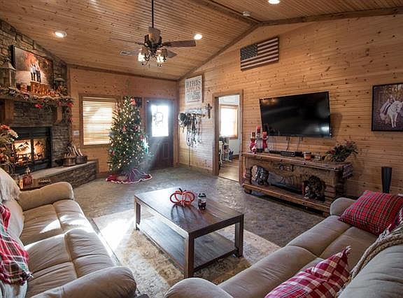 Rustic home recently remodeled. House is being sold with 8.7 acres. Additional acreage available. Property also has newly built 1 bedroom 1 bathroom cabin that is a must see with hand hewn cedar beams! Main living area features an open layout and vaulted ceilings. Beautiful fireplace. Master suite has a private living area and custom bathroom with a 6 foot custom soaking tub, granite counters, hand built cabinets, large walk in shower and window overlooking the valley and sunset. Huge kitchen w walk in pantry/utility area. Wood floors throughout. Stamped concrete in living room, tile in bathrooms. The property is set up for horses with small horse barn, chicken coop and cabin. Miles of riding trails, four wheeling, fishing, hunting and more!! Property is gated with electric gate. 30 minute commute to FLW, Osage Beach, Lebanon. Agent Owned.