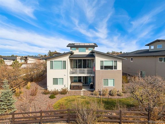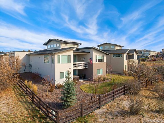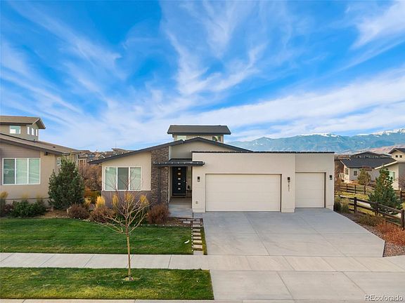 Stunning and immaculate, this mid-century modern gem in a cul-de-sac exemplifies sophisticated living at its finest! The thoughtfully designed layout with blonde hardwood floors on the main level draws you into the great room with 17' ceilings and a stunning linear fireplace with oversized wavy tile surround. The sleek and stylish kitchen is a chef's dream, featuring SS appliances, quartz countertops, and custom maple cabinetry. Adjacent to the kitchen is a spacious dining room perfect for entertaining and enjoying the stunning Front Range views! The primary suite exudes a tranquil ambiance and boasts a private en-suite bathroom with a steam shower and dual vanities. An additional bedroom, full bath, and a spacious study complete the main level. Double slider doors open to the captivating outdoor space with a meticulously landscaped yard, covered composite deck, and 6-person hot tub on the lower patio entices you to enjoy the outdoors. The lower level features a sprawling recreation room, wet bar, 2 large bedrooms, and a full bath. Be sure not to miss out on the flex room which provides a variety of uses such as exercise or crafts. To complete this home is a finished 4-car tandem garage with epoxy flooring. Situated in a prime location, this home provides convenient access to local amenities, renowned dining and shopping destinations, and top-rated schools. Check out the 3D video with incredible imagery attached below the photos for an immersive virtual tour and a list of features and inclusions. Make this impeccably cared for almost brand-new home in this highly sought-after maintenance-free community YOURS today!