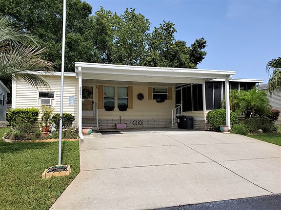 GREAT NEW PRICE! This home is on LEASED LAND with a monthly lot rent of $731.00 in the PREMIER Southport Springs Golf and Country Club community (55+ and pet-friendly). This is an adorable, fully-furnished Palm Harbor home that has over 1200 sq. ft. of living space including 2 bedrooms, 2 bathrooms and a FL room. All windows have vertical blinds. A double-wide carport is a plus. KITCHEN (9' x 12') Galley-style with plenty of cabinets and counter space and a breakfast bar with 2 tall chairs. Appliances includes a GE stove and built-in microwave, a French-door Kenmore refrigerator and a Kenmore dishwasher. The counters have tile backsplash and the kitchen, dining area and living room all have crown molding. The kitchen floor is covered by ceramic tile. DINING AREA (10' x 10') Plenty of space in this area for the table and 6 chairs that remain. A decorative light hangs over the table and the floor is beautiful wood laminate. LIVING ROOM (16' x 17'6") Big room with laminate flooring and a lighted ceiling fan. Items that stay include the sofa, over-sized chair and ottoman, leather recliner and ottoman, coffee table, two end tables, three lamps, TV stand and a side accent table with mirror. MASTER BEDROOM (13'3" x 13'3") Good-sized with carpet, a lighted ceiling fan and a huge wall-length, walk-in closet. The queen bed, night stand, dresser, armoire and two lamps come with the home. MASTER BATH Large with a double-sink vanity that has cabinets and drawers below, a walk-in shower and a three-door linen cabinet. The floor is half ceramic tile and half laminate and there is a shelf unit above the toilet. GUEST BEDROOM (10'4" x 11'4") Trundle bed that opens to a king bed, night stand, two lamps, an armoire, a desk with a chair and a rocking chair. Room has carpeting, a lighted ceiling fan and a wall closet. GUEST BATH Has a single-sink vanity, bathtub/shower, a shelf unit over the toilet and a 3-door linen cabinet in the hall. The floor is ceramic tile. LAUNDRY Located off the kitchen near the entrance to the Florida room are the Maytag washer and Kenmore dryer. here is shelving for your laundry supplies. The floor is ceramic tile. FLORIDA ROOM (12' x 12') Horizontal-sliding vinyl windows with a lighted ceiling fan, carpeted floor and wood roll shades. Relax on your wicker furniture (loveseat, two chairs, two ottomans, a coffee table and end table) while you watch the wall-mounted 32" Vizio TV. EXTERIOR The home has vinyl siding and asphalt shingles. The Frigidaire HVAC unit was new in '12. The home is located on a perimeter lot. The double-wide driveway holds 4 cars with 2 under the carport. The attached shed is 10' x 10' and it has plenty of shelves for storage. Southport Springs Golf and Country Club is the premier 55+ manufactured home community in Zephyrhills. The residents are very active and pets are welcome. The lot rent for this home is $731.00 per month. There is an additional pass-on tax of $55.84 per month and a monthly trash pick-up fee of $12.18. Zephyrhills water is billed through the park. Shopping, restaurants, a hospital and medical offices are all close by. All listing information is deemed reliable but not guaranteed and should be independently verified through personal inspection by appropriate professionals. American Mobile Home Sales of Tampa Bay, Inc. cannot guarantee or warrant the accuracy of this information, measurements or condition of this property. Measurements are approximate. The buyer assumes full responsibility for obtaining all current rates of lot rent, fees, and pass-on costs. Additionally, the buyer is responsible for obtaining all rules, regulations, pet policies, etc., associated with the community, park, or home from the community/park manager. American Mobile Home Sales of Tampa Bay, Inc. is not responsible for quoting of said fees or policies.