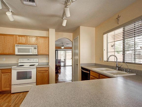 Fantastic move-in ready Home on a corner lot in the desirable Community of Cortez Ranch. Laminate wood floor throughout, designer color palette, ceiling fans, and Arcadia Doors to Arizona Room. Spacious eat-in kitchen features black/white appliances and oak cabinetry. Bright and cheery dining area. Huge backyard for your dream desert Oasis. Call today and start packing! This immaculate home is waiting for you!! Will NOT disappoint!