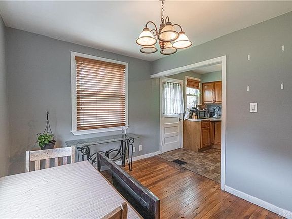 Great curb appeal is this 1.5 story home with newer windows 2020. Newer roof-shingles last 5 years. Maintenance free exterior with vinyl siding. 1st floor offers 2 bedroom, 1 bathroom, Living Rm, Din Rm. Walk up attic 2/3 partially floored-great for storage or to finish off for 3rd bedroom. Full basement, unfinished. Completely fenced backyard with deck and storage shed. Wood burning fireplace not warranted