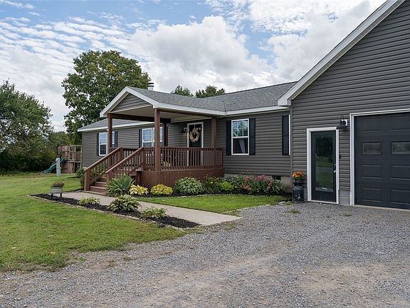 Looking to live in the country yet to close to amenities, this 6 year old single level home is only minutes out of Carthage & 15 mins to Lowville, Enter the home from the oversized covered front porch to find an open floor plan with all the upgrades including a raised roof to offer taller ceilings. The living room has a wood fireplace for those chilly nights, kitchen has hickory cabinets, stainless farmhouse sink & large center island with a dining area. To the left of the home you have 2 bedrooms both w/walk in closets & a full bath. To the right is the master suite w/a walk in closet & master bath complete w/custom walk-in shower. Patio door off the dining room leads to the huge back deck perfect for entertaining & the above ground pool. From the laundry room it leads to the attached 32 x 36 monster garage w/2 front & 1 back overhead doors, shop space & an upstairs w/a rec room area and an additional fully insulated & heated extra bedroom. On almost 1 acre of land you have plenty of room to play & enjoy the privacy of the country & no village taxes. Only 15 miles from Ft. Drum.
