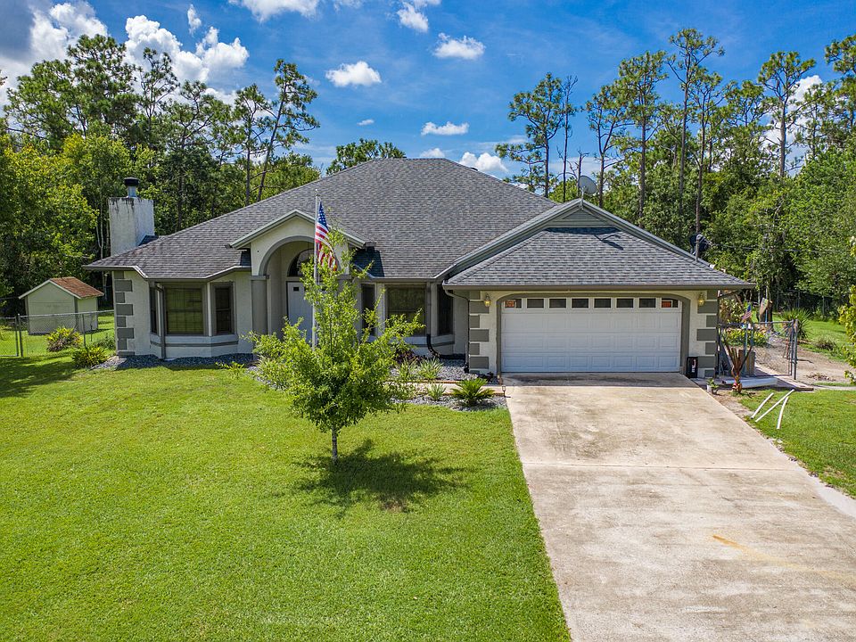 Discover the perfect blend of comfort and convenience with this spacious one-acre property so bring all your toys. Featuring a split floor plan it has 3 bedrooms and 2 and a half bathrooms this residence also boasts an open floor plan. The interior has two open rooms- one including a fireplace. There is tile all throughout the house with Pergo in the front rooms and bedrooms. The master bedroom is spacious with access to outside pool deck. Master bathroom is equipped with walk-in shower, tub, and double vanity sinks. The open concept in the kitchen and living room is great for entertainment and is also accompanied by two sky lights for all the natural light. Enjoy year around enjoyment with a solar heated pool set amongst ample space for outdoor activities. Located not far from the turnpike you can get to all the Orlando and surrounding areas.
