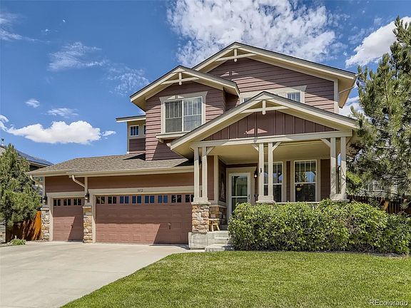 Great opportunity in highly desirable Saddle Rock Highlands/Tallgrass Community . Tastefully updated 2-story home set on a private, heavily treed double lot in a quiet cul-de-sac. Extensive outdoor living starting at the covered front porch followed up by large trex deck in the serene back yard. An open floor plan with a front living room and formal dining room accented by a bay window. Main floor bedroom or study with a 3/4 bath. Recently remodeled gourmet kitchen with 48 cabinets and exquisite slab granite countertops. All opening to a roomy family room with gas fireplace as the focal point. Second floor laundry with utility sink just off the expansive loft area. Primary bedroom accompanied by 5-piece bathroom with soaker tub and plenty of closet space. Two upstairs secondary bedrooms connected by a full bathroom with neutral decor. Finished basement with nice touches including the wood veneer ceiling in the recreation room or second family room and plenty of recessed lighting to brighten it up. Private bedroom with walk-in closet and an additional 3/4 bath. Cute wet bar for entertaining and lots of extra storage space. Three car garage with service door leading to the backyard and the 8 X 12 storage shed equipped with electrical . Eight windows replaced through the lifetime widow warranty. Roof is 4 years old with some new paint. One owner and well cared for home. Come see it today