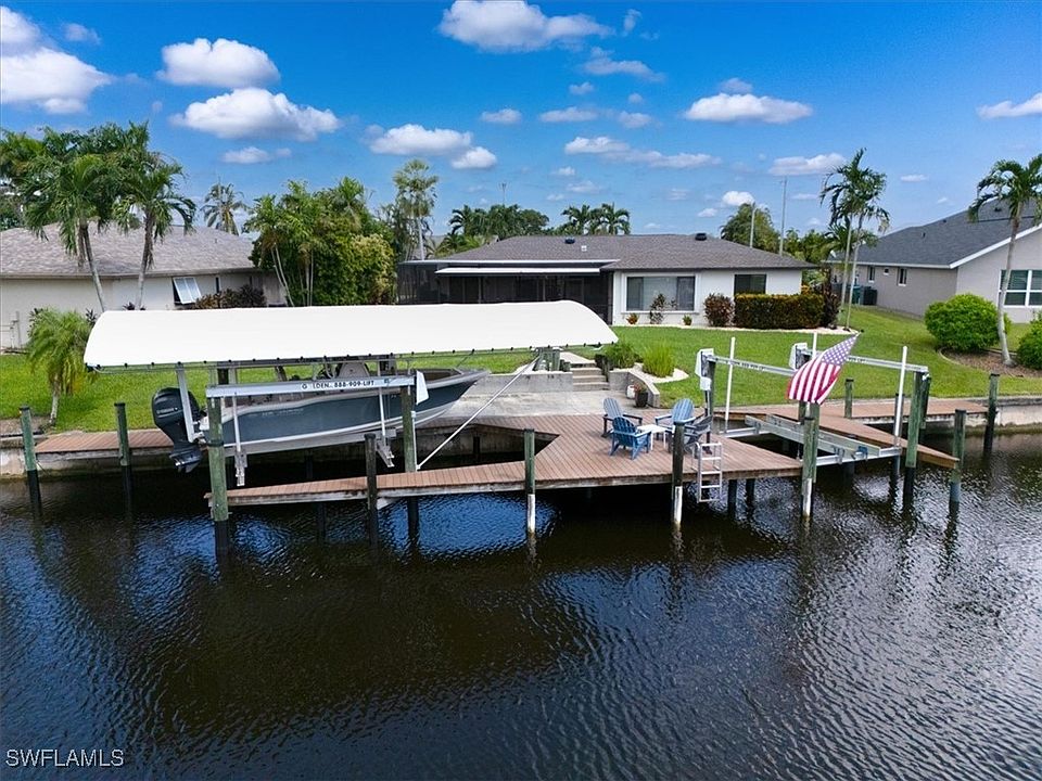 Welcome to a Meticulously Maintained Gulf Access Home on a quiet Cul-De-Sac Street. You will Enjoy Water Views & Sunsets along with the Home’s Interior Exceptional Features. The Elegant Crown Molding & Shiplap Accented Entry, Tile Floors throughout, Solid Wood Custom Cabinetry with Under Cabinet Lighting, Quartz Counters, Tile Backsplash, Newer SS Appliances including Range Hood, Drawer Microwave & Miele Dishwasher will WOW the Chef in the family. The Primary and Guest Baths have been updated with Tile Showers, White Cabinetry and Quartz Counters. The ideal Split Floor Plan offers Spacious Living Areas with Extra Storage. The Oversized Screened Lanai is accessible from 3 sets of Pocket Sliders that seamlessly blend the Indoor and Outdoor living. The Captains Walk Dock has Composite Decking with a 14,000# lift with Cover & a second 7500# Lift that allows you to live the Ultimate Waterfront Florida Lifestyle. Additional Features include New Roof, Epoxy Garage Floor & Roll Down Screen, a Spacious Home Office or Den, Smart Home options, Beautiful Curb appeal with Mature Landscaping, Generator Capable and Full Hurricane Protection. This Home is a Must See and definitely showcases Pride of Ownership and the attention to detail. A Quick Boat Ride to Open Water and a Short Walk to Restaurants. *This home has not had any water intrusion from any storm *