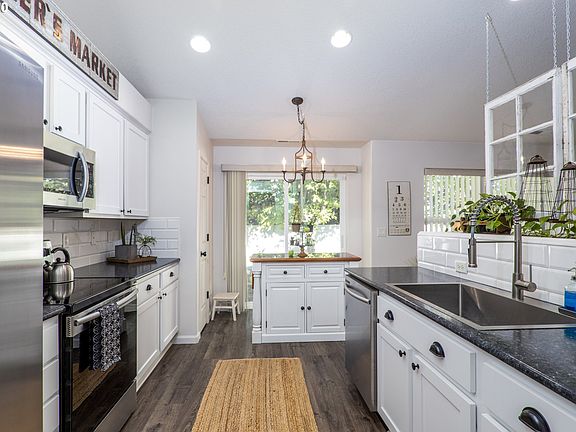 Come see this immaculately maintained 3 Bedroom, single level home in West Eugene. This home offers vaulted ceilings, a tastefully updated kitchen with new cabinets, counters, tile backsplash, and SS appliances. Pergo floors and carpeting throughout. Nicely landscaped yard with fresh mulch, green grass, underground sprinklers, and a fully fenced back yard with patio off of the kitchen.