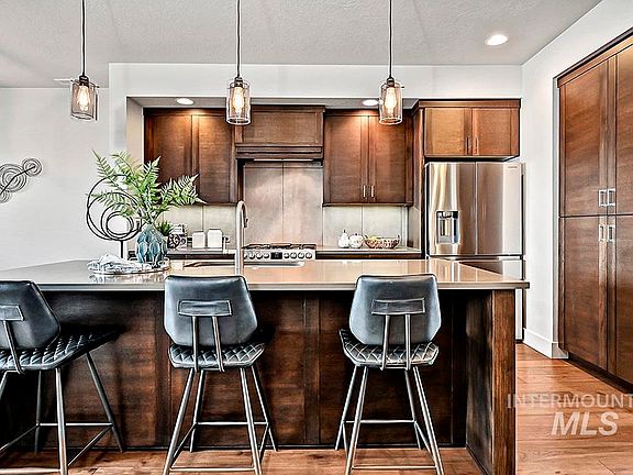 Lifestyle living at its best! Located right in the core of Harris Ranch, this tailored townhome sits at the intersection of luxury & convenience, just minutes to Greenbelt access, neighborhood dining, & countless parks & trails. The unique layout features an efficient three story floorplan, with the living quarters on the second level & the sleeping quarters on the first & third level. The refined finishes provide an upscale interior, featuring wide plank hardwood floors, tall ceilings, & modern light fixtures. The clean contemporary kitchen was designed to feature a delicate blend of materials & contrast, equipped with rich wood cabinetry, concrete-style backsplash, & quartz countertops. A built-in desk nook sits just off the kitchen serving as a convenient central workspace, while a sizeable bonus loft sits just at the top of the stairs, ideal for a more quiet place for work, studies, or play. Simple elegance defines the primary suite, with a generously-sized bedroom & sleek en suite bathroom.