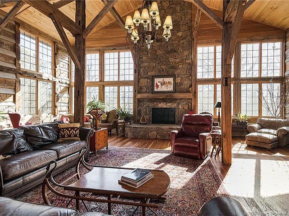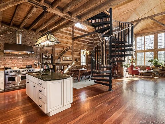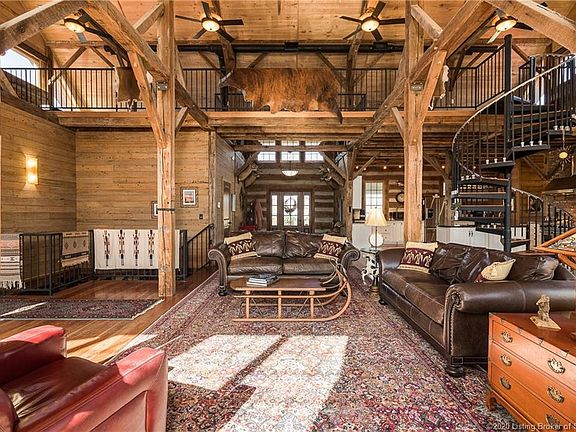 A Longstanding commitment to Stewardship to pass to future generations. The definition of this farm, 2 century old barns were recrafted into this Magnificent Montana Style Log Home located just 30 easy minutes to downtown Louisville. Meticulous attention to detail shines throughout this home with impressive beams and over 360 panes of windows that provide an abundance of natural light overlooking approximately 80 wooded acres and 5 pasture acres with miles of manicured trails. The 3 story Creek Stone Fireplace is the center point of this remarkable home! Notice the stone accents throughout. A massive Great Room with impressive loft area (could be finished into additional rooms), a custom spiral staircase, highlighted by custom ironwood; main chandelier has a center crystal weighing over 50 lbs. Massive open Kitchen that contains a Viking Stove with stone and brick backsplash and custom sink that represents a flowing stream. The steps leading to the lower level are repurposed boards from a ferry boat on the Ohio River. The Master Suite has a 2 story Creek Stone Fireplace, a Reading Nook, massive Walk-in Closet with washer & dryer and a huge Master Bath with steam shower. If a secluded, rustic and cozy home is what you are looking for, then look no further! This BEAUTIFUL, IMMACULATE Log Home is a nature lover's dream! 63x40 Pole Barn with concrete floor, back side is ready for stalls.