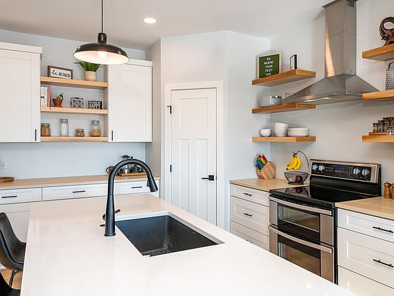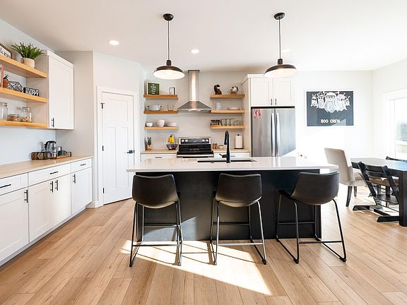 6 bedroom ranch style home in a quiet north Bismarck neighborhood. This spacious home was built in 2018 with timeless and clean finishes in mind. The main floor features an open concept living space with a natural gas fireplace. The kitchen boasts clean white and black shaker style cabinets, open shelving, stainless steel appliances and a corner pantry. The primary bedroom suite includes a tiled shower, larger soaker tub and walk in closet. The main floor includes 2 additional bedrooms and a full bathroom. There is large mud room/laundry room off the garage. The large basement features a generous theater room with a projector and built in surround sound. The three bedrooms in the basement have great space and lighting. There is a bonus room under the stairs that can be utilized as a craft room or office. The utility room has adequate space for additional storage. The garage is heated and has a floor drain. The large lot has a sprinkler system and plenty of room to roam. See what this home has to offer, schedule a showing with your Realtor today.