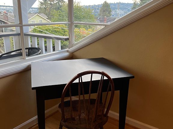 Top level furnished apartment available in Wallingford craftsman on quiet street. This bright and spacious apartment features views, hardwood and tile floors, tall ceilings, freshly painted walls and quaint 20's architecture. The kitchen offers a large amount of storage, dining area has built-in shelving, and living areas are large and comfortable. Popular bus routes and the Burke-Gillman trail are blocks away. Grocery stores, restaurants, bars, and local shops are are located within walking distance. The neighborhood is safe and quiet, features craftsman homes and beautiful gardens. Homeowners live on on lower level. Owner pays water, sewer, gas, and WIFI. Renter is responsible for gas and electric. Last months rent due at signing. No smoking allowed.