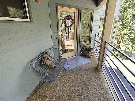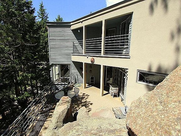 Beautiful 2-Story Contemporary Home. Nestled among rock outcroppings this home has been perfectly cared for by original owners. Public water and sewer, recently sealed large driveway leading to oversized 2-car garage. Enjoy a private setting while having the convenience of paved roads and close proximity to shopping. Walk through the custom leaded glass front door to discover elevated forest views from every direction of the living room; a wood burning stove surrounded by pink marble, updated kitchen with Corian counters; stainless steel appliances; wood floor; and walk out to private stone deck. Relax on the deck to the sounds of the built in waterfall through the rock outcroppings. Visited by humming birds, fox, and elk, this home is the perfect peaceful setting. Relax in the master which features a five piece bath with glass shower, soaking tub and a large walk-in closet. Feel part of the trees in the bedrooms with floor to ceiling corner windows. Mountain living and convenience come together in this one of a kind home.