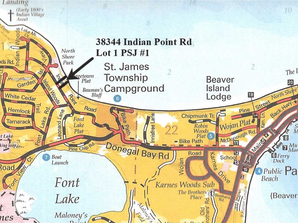 A North Shore lakefront site facing northeast with a fantastic view of Garden & Hog Islands and the Pass between Garden & Beaver. It has 78.16' of frontage down at the water's edge and the lot is 75 ft wide over its full 300 ft length. The building site is on a bluff looking down at the lower plateau and toward the beach frontage. A lot of the houses to the south & northwest of this lot have been built with the structures right at the edge of this bluff. The Gallagher home at 38360 Indian Point Rd. is one lot northwest of this Lot #1. Some trimmings of the trees out front needs to be done to really open up the view that would then take in four of the Islands to the north. Chances are that adjacent property owners would participate in doing a common project to really open it up. This location is just northwest of the Pagetown Plat shown on the Wojan Cashman Map of Beaver Island. It's an easy and fast trip back to town, not too far from Font Lake and just a 3/4 mile drive or bike ride to Donegal Bay. The driveway is in, with electric service on the site and a foundation is already in place - ready for you to build your cottage on.